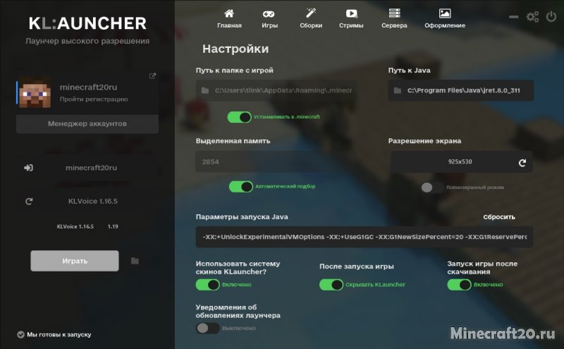 Разумеется, присутствует множество настроек для комфортной игры через KLauncher: выбрать количество выделенной оперативной памяти, скрывать лаунчер после запуска игры, включить систему скинов и т.д.
