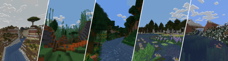 - Полная переработка генерации мира: континенты, текущие реки, горные хребты, разнообразные леса, флора и фауна.