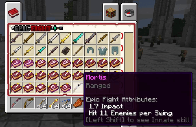 - Мортис (p1nero_bow:mortis) — уникальное оружие, которое можно найти во вкладке творческого режима Epic Fight. При выполнении базовой атаки нажмите [%s], чтобы нанести сокрушительный ближний удар и сбросить комбо. Когда счётчик достигает максимума, вы получаете силу двойных стрел.