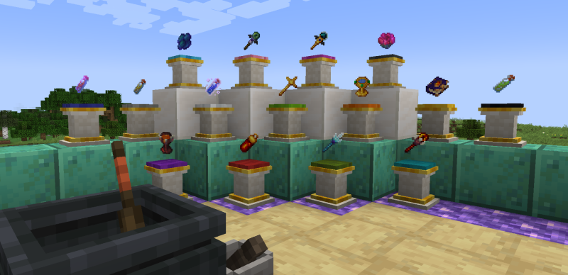 - Пьедестал: Многофункциональный блок, который может отображать предметы, а также выполнять различные действия в зависимости от размещённого в нём предмета, например, собирать ресурсы, атаковать мобов или работать как автоматическая ферма.