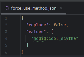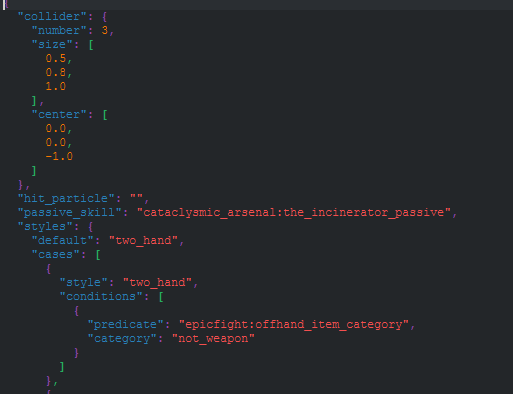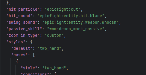 - Пассивные навыки: Позволяет добавлять пассивные навыки к категориям оружия через строку "passive_skill": "namespace:skill_name". Важно учитывать совместимость с Innate Skills во избежание сбоев.
