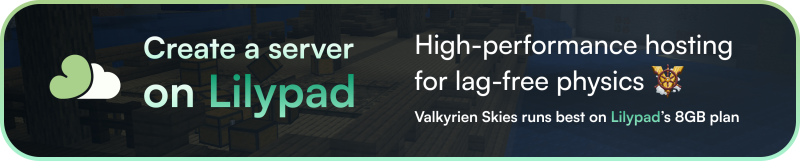 Примечание: Valkyrien Skies — библиотечный мод, для обычного геймплея нужен аддон. Рекомендуется Eureka или другие из списка на вики.