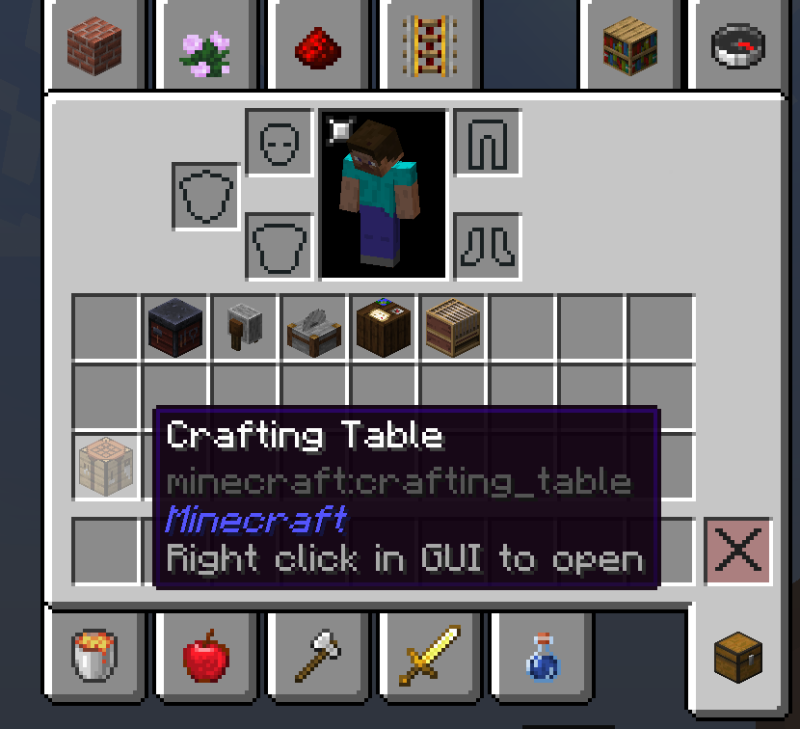 • Нет GUI: ПКМ собирает все подходящие предметы из инвентаря (кроме панели быстрого доступа и слотов брони), Shift+ПКМ выливает все предметы.
