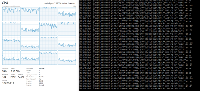 Генерация трех миров одновременно с использованием процессора Ryzen 3700X + 16 ГБ ОЗУ.