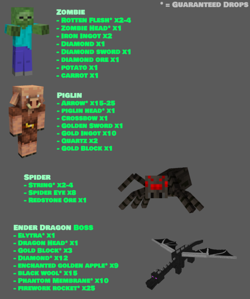 • Зомби: Гнилая плоть* x2-4, Голова зомби* x1, Железный слиток x2, Алмаз x1, Алмазный меч x1, Алмазная руда x1, Морковь x1, Картофель x1
