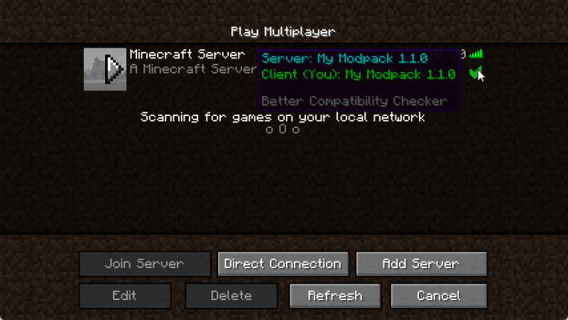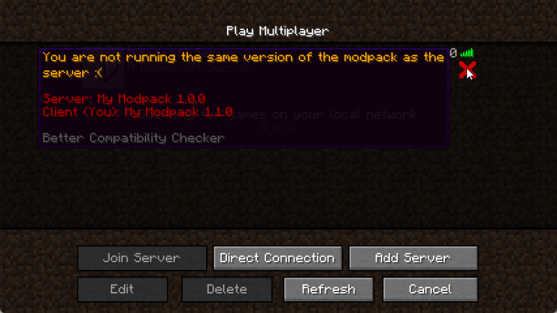 Проверка совместимости серверов Forge не всегда точна и может вызывать проблемы у пользователей модпаков, когда сервер отображается как несовместимый. Этот мод исправляет эту проблему, сравнивая ID проекта модпака и версию, заданные автором в конфигурационном файле, и отображая галочку при совпадении или крестик при несовпадении.