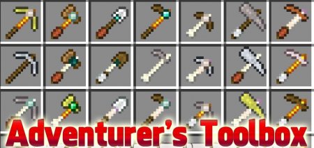 Adventurer’s Toolbox - мод на Майнкрафт 1.12.2, который добавит возможность создавать оригинальные инструменты и оружие из разных частей. Теперь такое орудие имеет больше различных свойств. К примеру, к золотой кирке добавляем алмаз, кость и что-нибудь ещё.