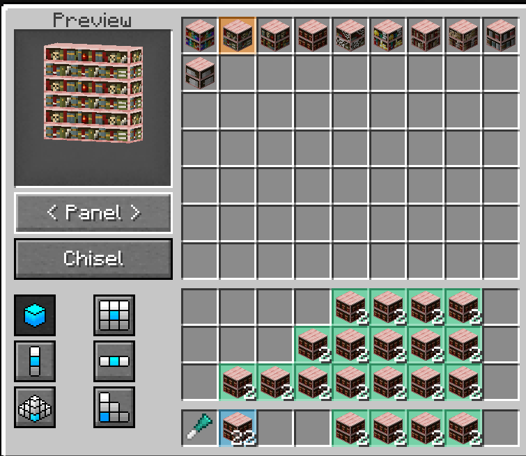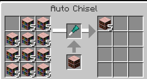 Chisel добавляет огромное разнообразие декоративных блоков в игру. Мод очень полезен для любителей строительства в Minecraft. Доступ к новым блокам осуществляется в основном через один инструмент — зубило. Железное зубило создаётся из железного слитка и палки, расположенных по диагонали. Щелчок правой кнопкой мыши открывает интерфейс создания блоков.