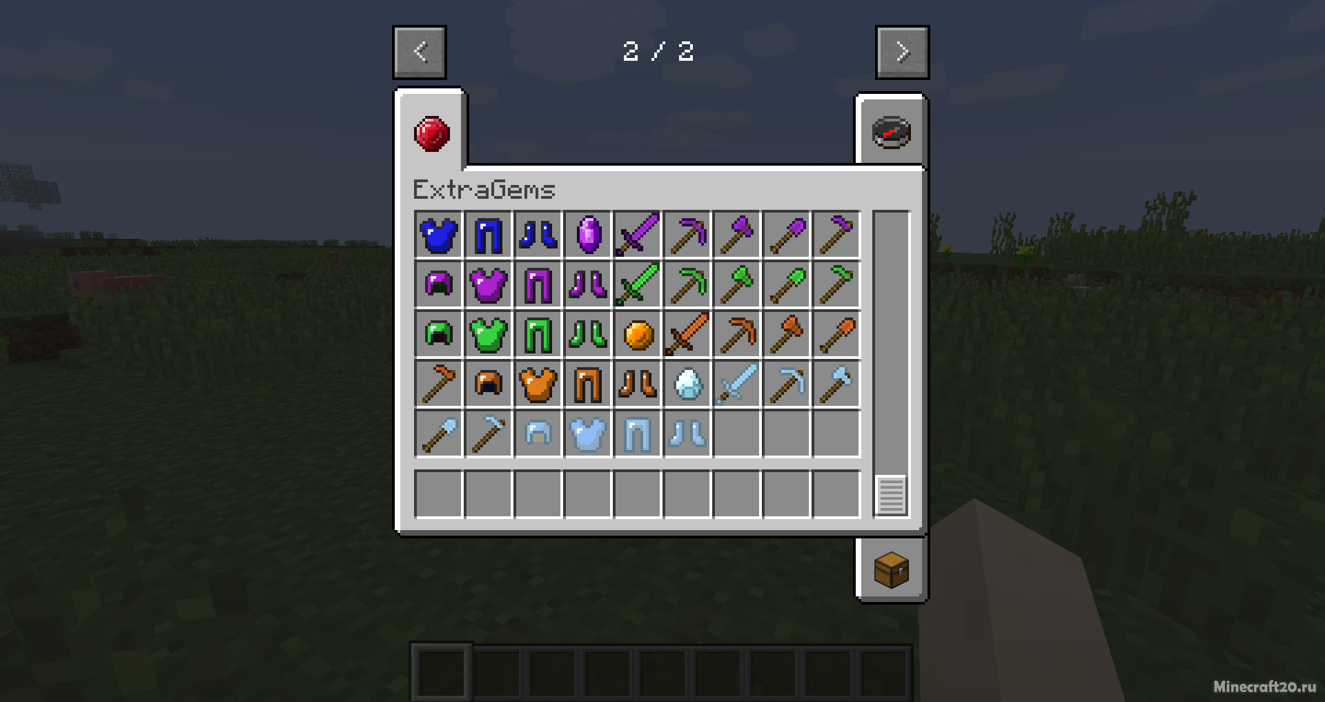 Установив мод ExtraGems в Майнкрафт 1.20.4/1.19.4 появятся новое оружие, инструменты и броня. Всё это будет крафтится из новых ресурсов, а в частности появятся новые руды: рубины, сапфиры, изумруды и аметисты. Новые ресурсы вы можете найти так-же как и простые, в шахтах. Руды имеют хорошие свойства и защищают примерно так-же как и алмазные вещи.