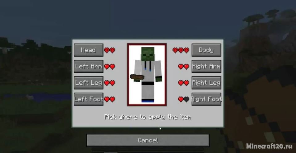 First Aid - это мод для Майнкрафт 1.19.4/1.18.2, который меняет структуру здоровья персонажа в Майнкрафт. Теперь же, идентификаторы здоровья будут делиться на отдельные части в зависимости от частей вашего тела. К примеру из набора доспехов вы повредили ноги, соответственно вашим ногам будет нанесёт ущерб здоровья, это вы заметите по показателем сердец частей тела.