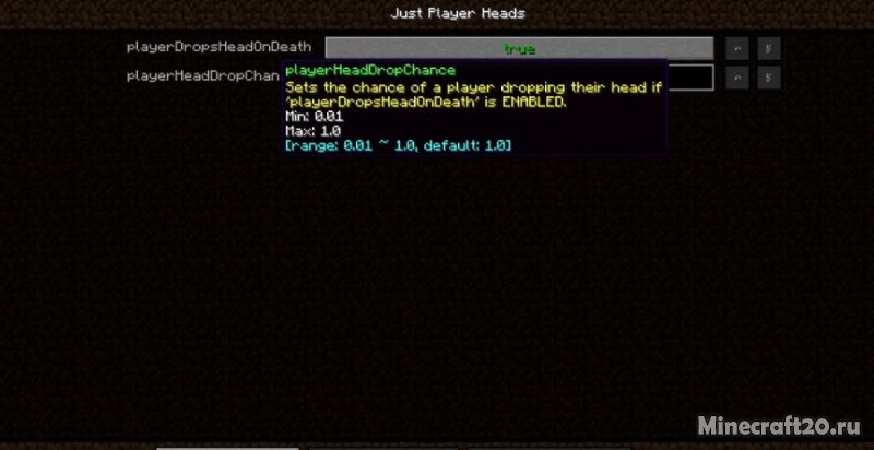3. Можно настроить мод. Игрок сможет выключить генерацию голов, а также тот шанс, с которым они будут выпадать при смерти другого игрока.