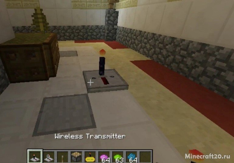 Беспроводной пульт дистанционного управления - это предмет, который вы можете держать в руке, чтобы вручную посылать сигнал Redstone на выбранную частоту. Удерживая Shift, щелкните правой кнопкой мыши с беспроводным пультом дистанционного управления в руке, чтобы открыть графический интерфейс для изменения частоты.