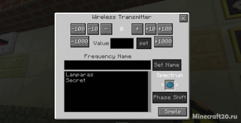 Беспроводной передатчик может отправлять сигналы красного камня на беспроводные приемники. Частоту можно установить, щелкнув блок правой кнопкой мыши. Частота будет отображаться и на самом блоке. Также следует отметить, что по умолчанию выбрана частота 0. Эта частота не может использоваться для передачи сигнала.