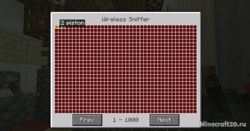 Беспроводной сниффер - это элемент, добавленный модом Wireless Redstone, который «обнюхивает» активированные частоты сигнала. Когда активирована частота Wireless Redstone, загорается затемненное красное поле, назначенное этой частоте. Вы можете увидеть это значение частоты, наведя указатель мыши на поле. Доступно 5000 частот.