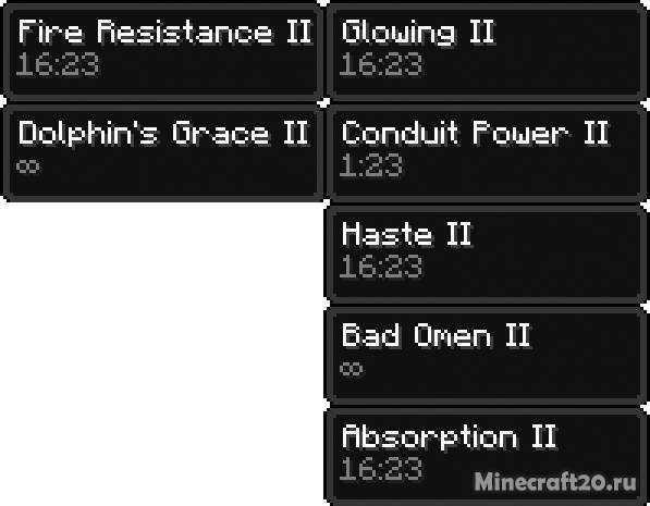 Есть несколько вариантов для информационных панелей. Первая панель отображает время действия эффектов, а также иконку самого эффекта. Вторая покажет название эффекта, а также время его действия. Третья же поможет просто увидеть действующий эффект.