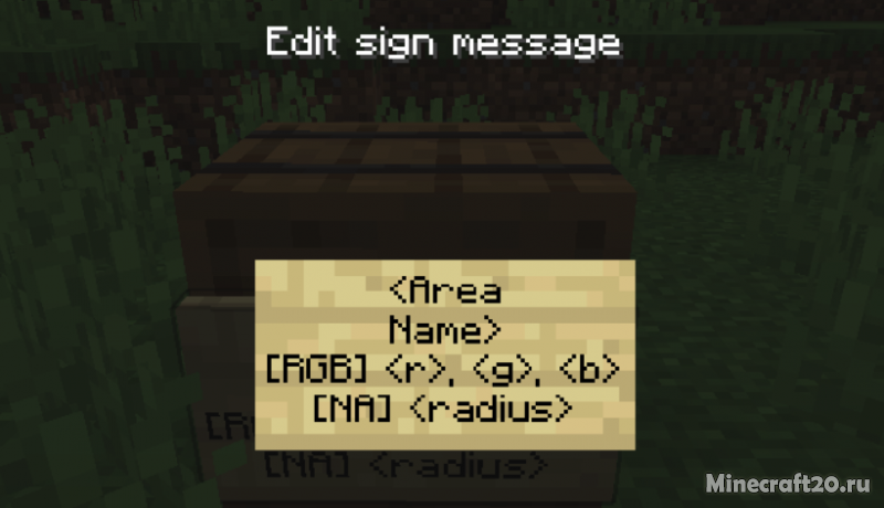 Первые три строки являются частью названия области. Последняя строка содержит «[NA]» (именованные области) и «» радиус в блоках вокруг знака.