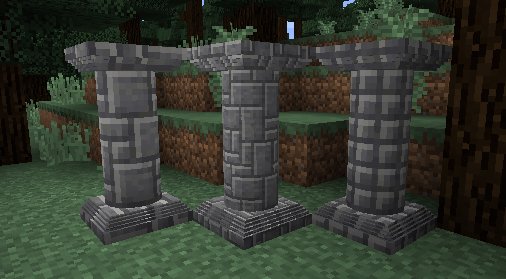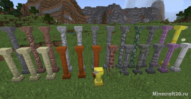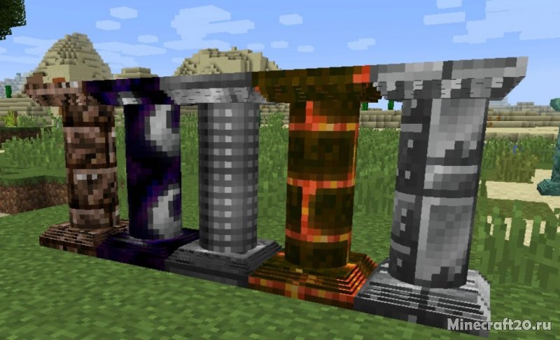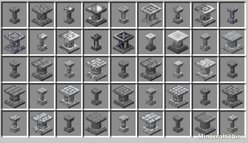 Этот мод легкий, не использует TileEntity (Тайтлы) и содержит 126 видов столба: камень, гранит, диорит, андезит, булыжник, песчаник, кирпич, каменный кирпич, пурпур, железо, золото, кость и так далее, плюс вспомогательное долото.