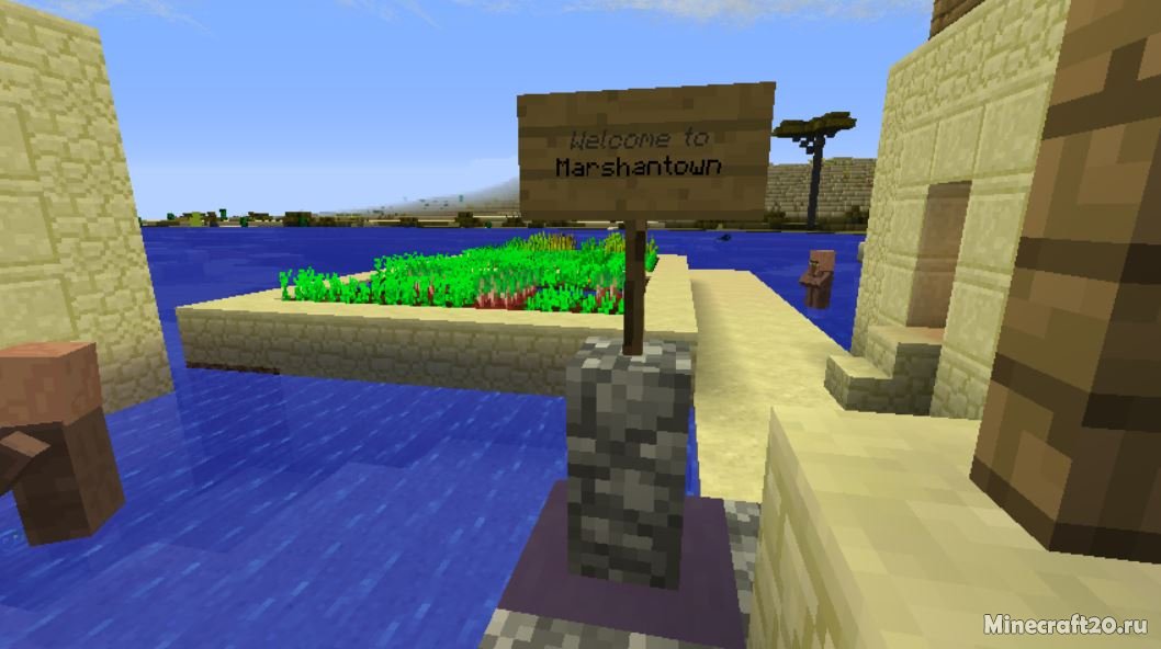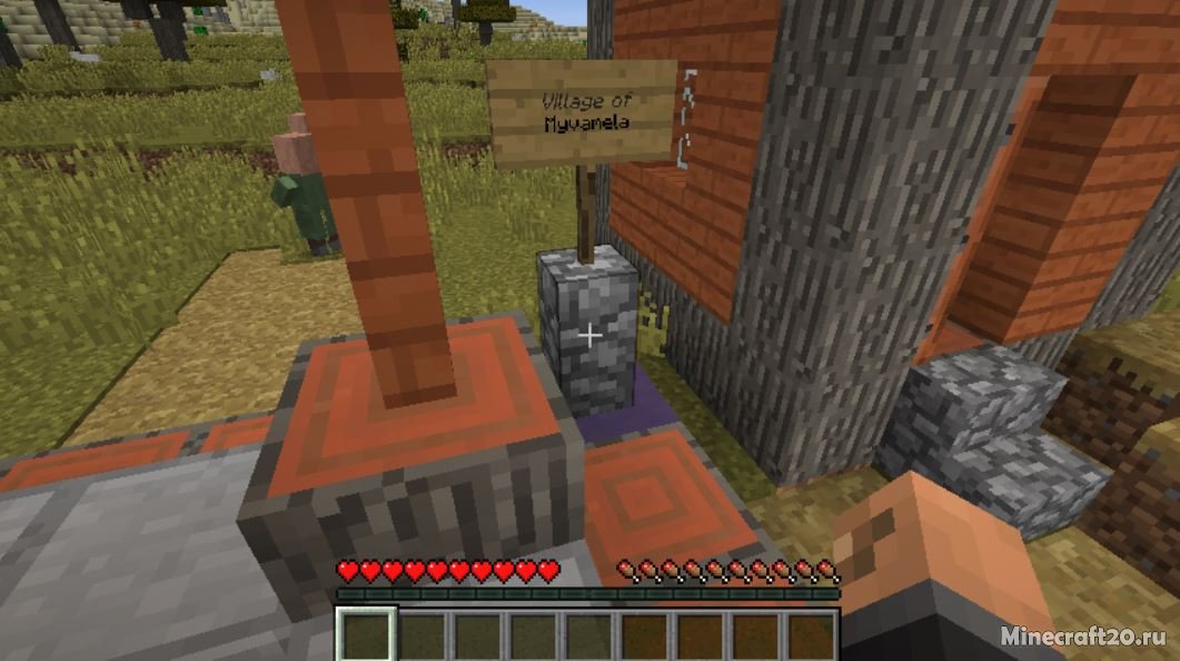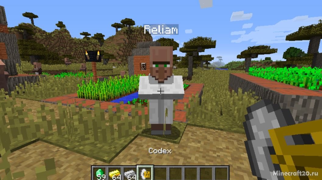 К именам жителей прибавляется название его профессии, а при хорошем доверии к ним, они могут написать вам в книге координаты чего-нибудь интересного. А доверие можно приобрести за изумруды, просто возьмите с собой стак и кликните по персонажу. При создании деревни, создаётся при помощи генератора специальный знак, а опция в конфиге изменяет скважину колодца на плиты, для того чтобы жители деревни не застревали в ней.