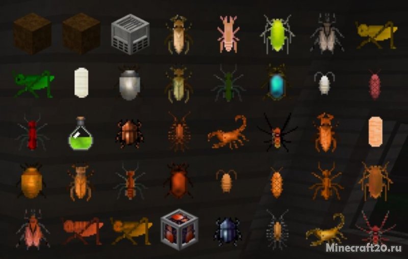 Edible Bugs - мод на Майнкрафт 1.18.2/1.17.1, после установки которого у вас появится простой способ утолить игровой голод. Теперь ломая блоки грязи, травы и деревьев у вас появится возможность обнаружить различных жуков, которых можно есть. А еще, по миру будут генерироваться блоки термитников.
