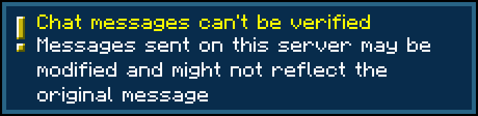 - 3. И клиент, и сервер: подпись будет удалена на стороне клиента перед отправкой сообщений на сервер, сервер не будет пытаться проверять подписи сообщений. Отчеты о чате и Показать только безопасный чат не будут работать, и игроки будут уведомлены о том, что эти функции отключены модом при попытке их использовать.