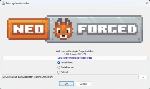 - Дважды щелкните загруженный файл NeoForge. Нажать кнопку «ok». После установки NeoForge снова нажать кнопку «ok»